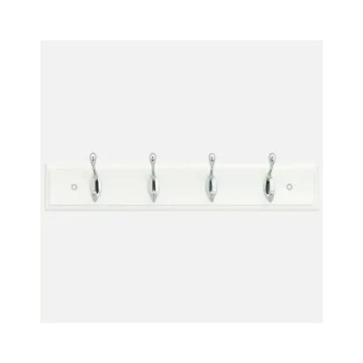4 chrome hat and coat hooks fixed onto a white painted wood board. Offers practical hanging space for hats, coats, robes, and other garments in hal...