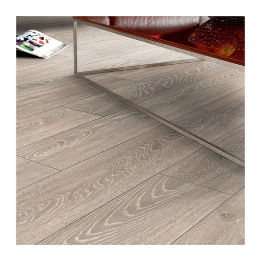 Infuse your space with vintage allure using Bordeaux Oak Grey, a high-quality 12mm laminate flooring option that boasts a weathered grey oak color ...
