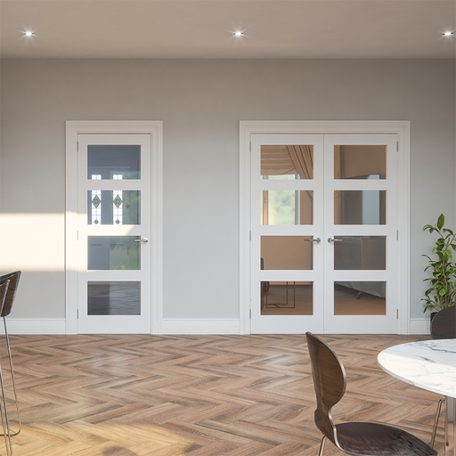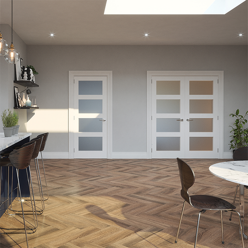 Indoors Kirkland Etched Glazed Primed Door, a stylish shaker style door with 4 horizontal panels that effortlessly complements contemporary project...