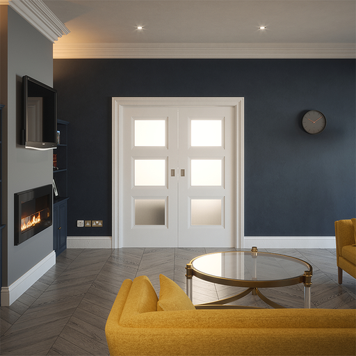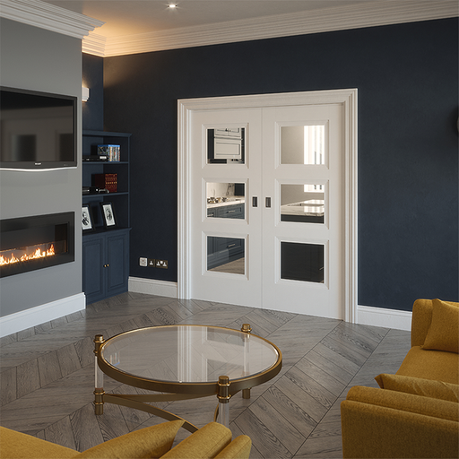 Indoors Kenmore Opaque Glazed Primed Door, a perfect blend of contemporary elegance and functionality that elevates the ambiance of your living spa...