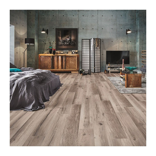 Infuse your space with vintage allure using Bordeaux Oak Grey, a high-quality 12mm laminate flooring option that boasts a weathered grey oak color ...