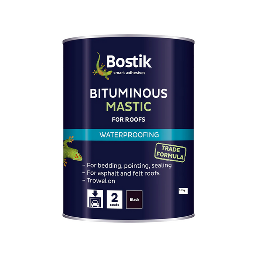 Bostik Bituminous Mastic for roofs can be applied to mastic asphalt, roofing felt, corrugated iron, cast iron, fibre cement, slates, lead, copper, ...