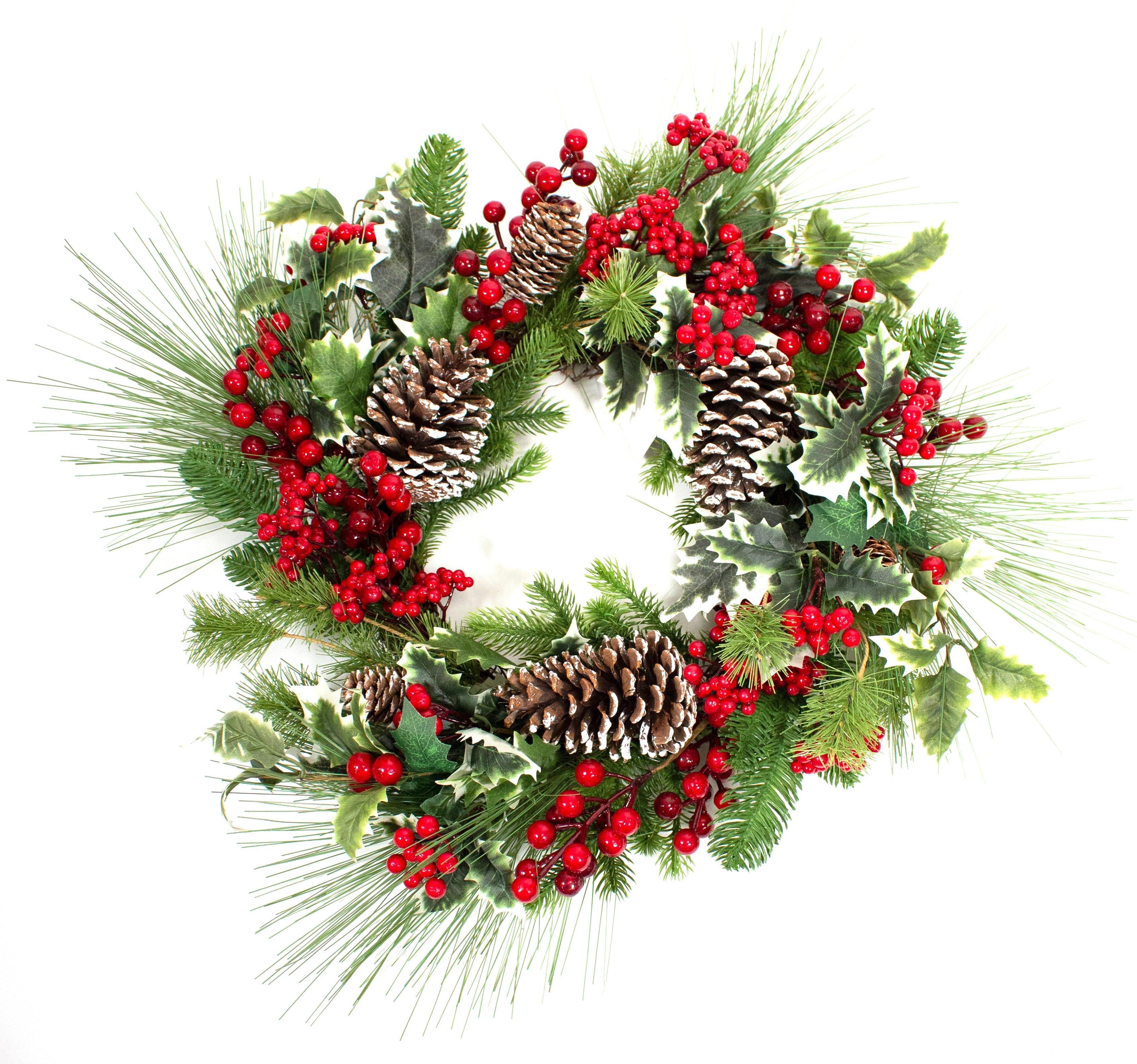 - Christmas Wreath With Red Berries, Pine Cones & Holly