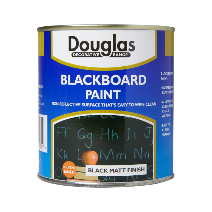 Transform any surface into a functional chalkboard with Douglas Matt Blackboard Paint. This 250ml tin of high-quality paint is perfect for creating chalk-friendly surfaces in your home, office, or classroom. Ideal for adding a fun and practical touch to walls, doors, furniture, or craft projects, this paint dries to a smooth, matt finish, offering a classic blackboard look. Specially formulated dense black paint to produce new or renovate old blackboards. It allows for clear legible chalk writing.