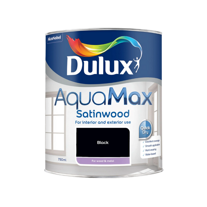 Dulux AquaMax Satinwood Black lets you brighten your woodwork and metal not just inside but outside too. It goes on smoothly, giving you a gorgeous finish on woodwork inside and outside your home. Plus, it’s fast drying so that you can get on with your day. Fast drying with excellent coverage, up to 18m² per litre. A water-based and hard-wearing paint.