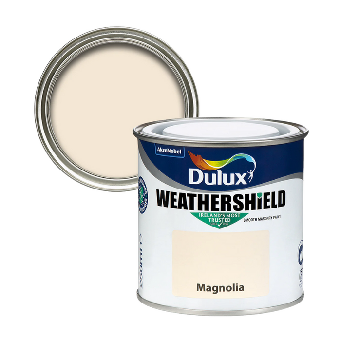 Dulux Weathershield Magnolia, the pinnacle of smooth exterior masonry paint crafted in Ireland to safeguard homes against our unique weather conditions. With its ultimate durability formula and superior flexibility, it prevents cracking and flaking, ensuring long-lasting protection for your home's exterior surfaces. Superior mould resistance with slow-release encapsulated biocide technology. Its smooth formulation makes it easy to apply and discourages dirt retention.