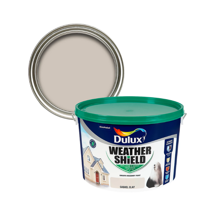 Dulux Weathershield 10L Cashel Clay, the pinnacle of smooth exterior masonry paint crafted in Ireland to safeguard homes against our unique weather conditions. With its ultimate durability formula and superior flexibility, it prevents cracking and flaking, ensuring long-lasting protection for your home's exterior surfaces.
