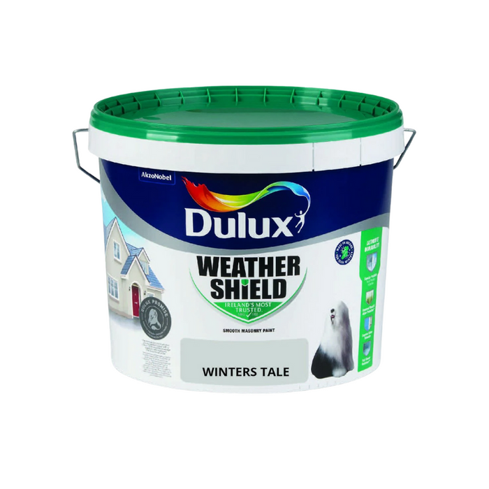 Dulux Weathershield 10L Winter's Tale, the pinnacle of smooth exterior masonry paint crafted in Ireland to safeguard homes against our unique weather conditions. With its ultimate durability formula and superior flexibility, it prevents cracking and flaking, ensuring long-lasting protection for your home's exterior surfaces.