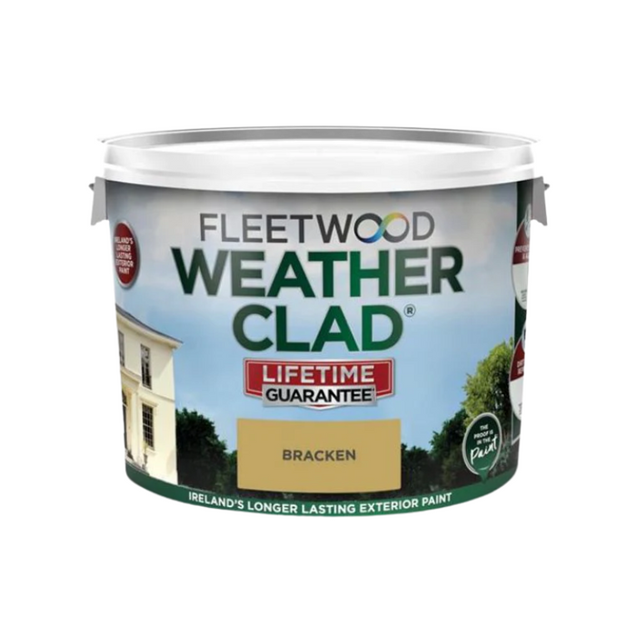 Fleetwood 10L Weatherclad Bracken, the epitome of long-lasting exterior paint designed for the rugged Irish climate. Crafted in Ireland, this premium paint offers built-in mould resistance and can endure up to 18 years of protection. With exceptional coverage and super adhesion, it boasts UV and fade resistance to maintain its vibrant color over time. Its matt finish adds a touch of elegance to your exterior surfaces, while its water-based formula ensures easy application and environmental friendliness.