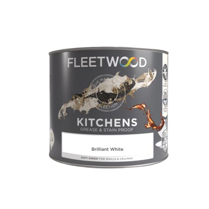 Fleetwood Kitchens Paint in Brilliant White is grease & stain resistant. It has a smooth, flat Matt finish and is scrubbable. Fleetwood Kitchens is available in various ready-mixed trending colours in a scrubbable and washable matt finish. Fleetwood Kitchens is 50 times more washable than typical matt emulsions paints. Fleetwood Kitchens paint is suitable from use on ceilings and walls.