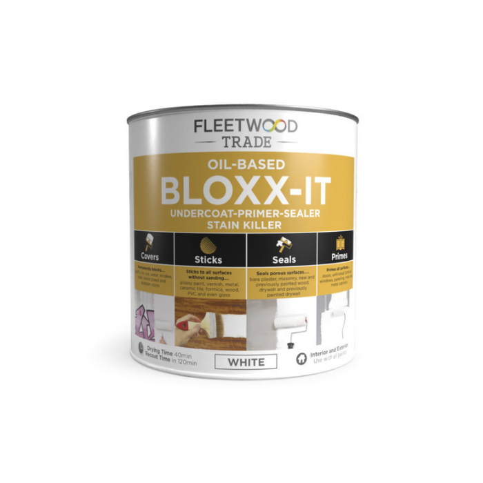 Fleetwood Bloxx-It is a premium quality, modified, alkyd stain-blocking primer undercoat. It dries quickly, has great hiding power and outstanding stain killing. Stains of all kinds are sealed so topcoats are blemish free. Fast drying recoat in less than 2 hours. Excellent for sealing damp and water soluble stains. Excellent opacity blocks most stains including nicotine and smoke. Suitable for interior and exterior applications. Sticks to all surfaces without sanding.
