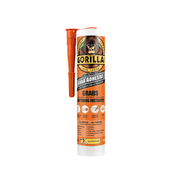 Gorilla Heavy Duty Grab Adhesive is so versatile, it grabs virtually anything instantly. The flexible, gap filling formula provides a long-lasting, heavy duty bond. This is a grab adhesive that’s 100% waterproof and withstands extreme temperatures, meaning you can use it indoors or out, even underwater, for an extra-tough bond that’ll last. Easy to use with a flexible, fast grab formula which bonds virtually anything. Provides a long-lasting heavy duty bond. Suitable for both indoor and outdoor use. Fills voids with little or no shrinkage.