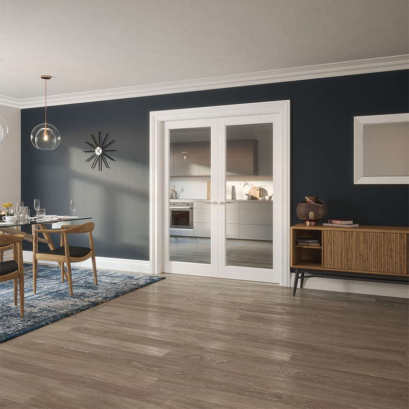 Indoors Kenmore Clear Glazed Primed Door, a stunning addition that allows abundant light to flow through and brighten your living space. This contemporary, elegant shaker style door brings a touch of sophistication and versatility to any room, making it a modern classic choice. Crafted with meticulous attention to detail, the door is guaranteed not to shrink, warp, or twist, ensuring long-lasting durability and stability. Primed in a neutral white color, it serves as a blank canvas for you to express your creativity and finish it in any color of your choice, allowing you to create a truly unique and personalized look.
