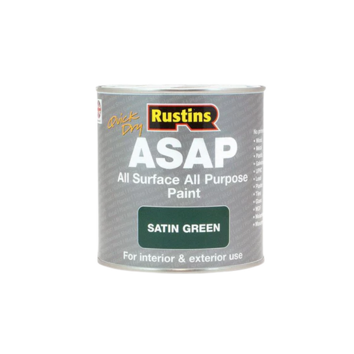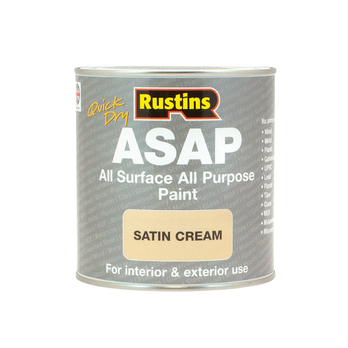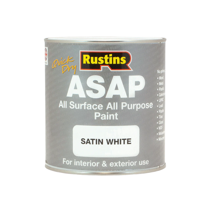 Rustins ASAP (All Surface All Purpose Paint) is a water-based paint that dries to a satin finish. It resists flaking or peeling because of its flexible capabilities. Can be used indoors and outdoors on multiple surfaces. It is touch dry in 30 minutes and re-coating time is approximately 2 to 3 hours. 1 litre covers approximately 12-14 square metres in 1 coat. Low odour & gives a flexible satin finish. Can be used on wood, metal, plastic and galvanised steel.